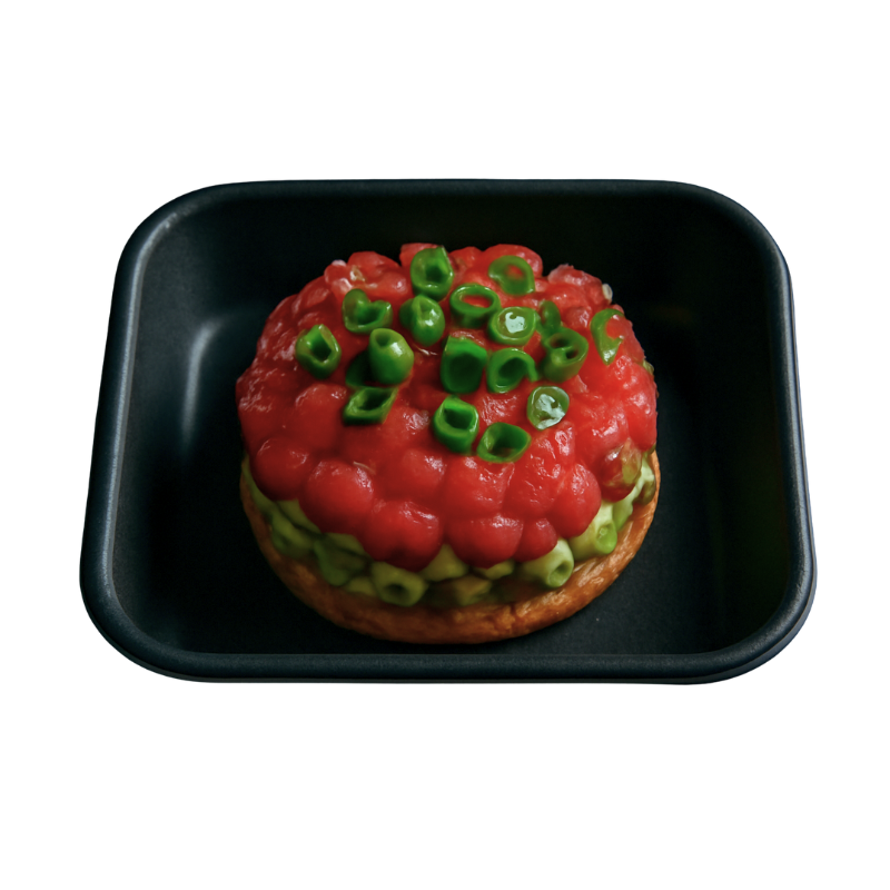 Tartar de atún fresco, marinado con aceite de oliva, aguacate y cebollín, servido sobre una base crujiente.
